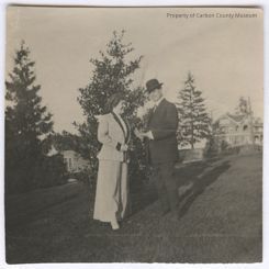 Update - June 2010: Black & white print. Snapshot. Image of a man & woman standing on a grassy lawn. Trees & houses in background. Woman is wearing a long light colored suit with dark trim. Man is dressed in a dark suit & hat.