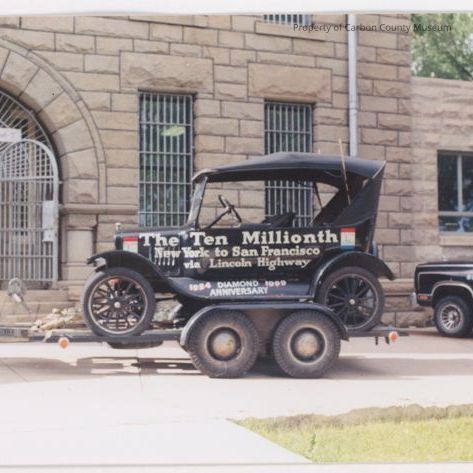 Update 2009: Color print, snapshot. Image of a vintage Ford automobile on a trailer parked in front of a multi-story stone building with barred windows and doors. Painted on side of car: "The Ten Millionth New York to San Francisco via Lincoln Highway". "1924 Diamond Anniversary 1999". Barred door open at left, front of contemporary automobile at right. Automobile has canvas fold down top.