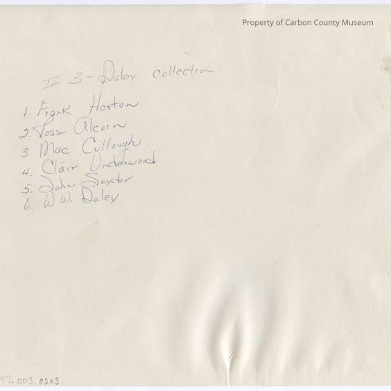 Written on back in blue ink: "1. Frank Horton 2. Ross Alcorn 3. Mac Cullough 4. Clair Underwood 5. John Snyder 6. W. W. Daley