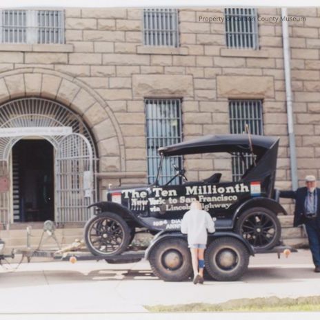 Update 2009: Color print. Snapshot. Image of a vintage Ford automobile on a trailer parked in front of a multi-story stone building with barred windows and doors. Three people looking at automobile-young person at nearside looking at the running board; man and woman at back.