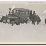 Update March 2011: Black & white snapshot print of a vintage car in snow up to the axles & running boards. Four people in heavy coats are by the car, one is shoveling at driver's side rear wheel. Driver's side of car is lower in the snow & snow is above the bumper in front. License number is "15058"