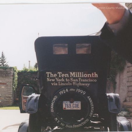 Update 2009: Color print. Snapshot. Image of the back end of a vintage Ford automobile parked in the courtyard of a multi-story stone building with barred windows. Painted on the back of the automobile: "The Ten Millionth New York to San Francisco via Lincoln Highway." [On spare tire cover] "Diamond 1924 Ford 1999 Anniversary". "N.Y. to San Francisco". A person's arm crosses image at upper right.