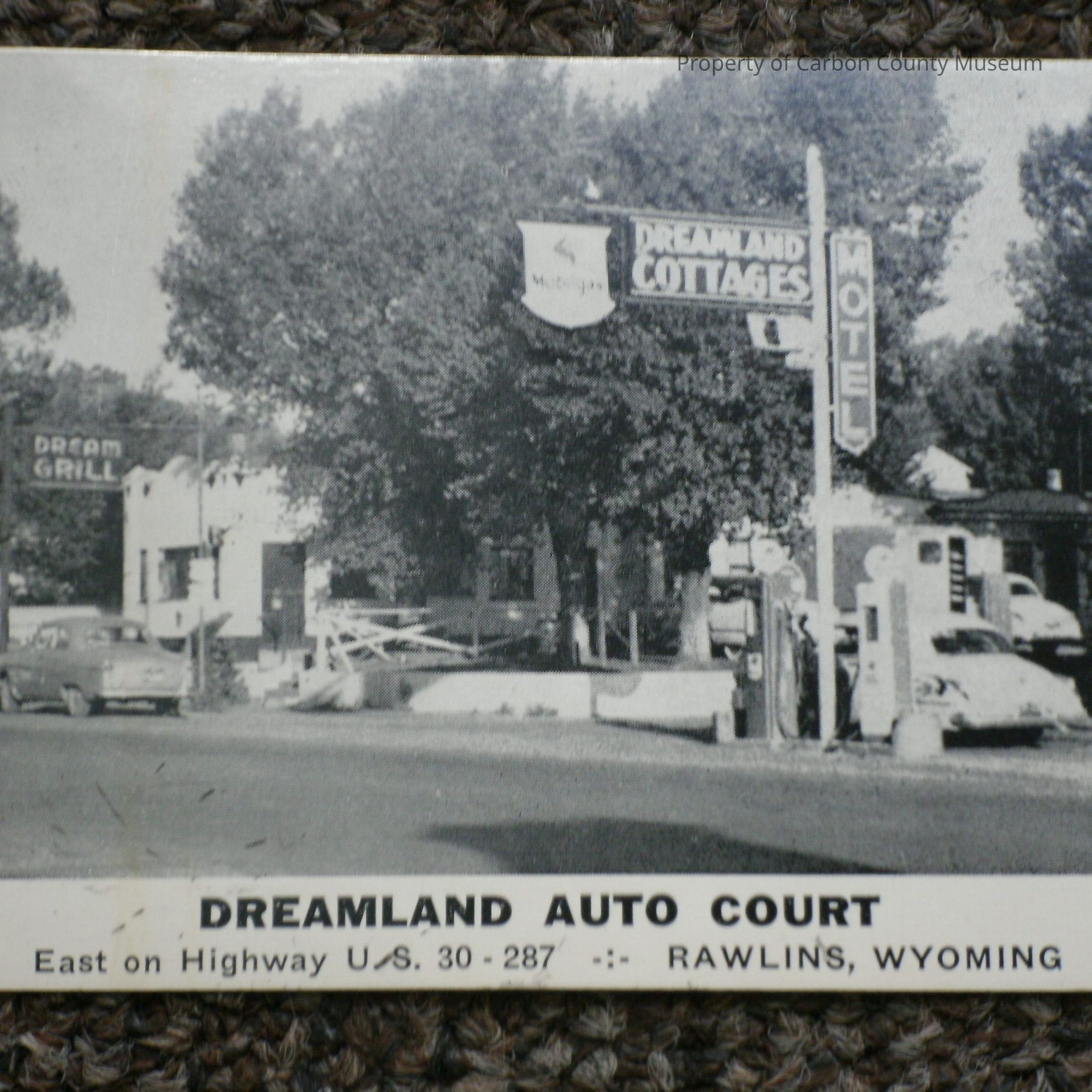 A black and white photographic print postcard with an image of an early day motel and cafe surrounded by large trees, gas pumps and service station at side right, moter courts seen in background and small white building at side left with the sign, Dream Grill. Cars are parked along the side of the street edge. Printed in black on lower edge: "Dreamland Auto court, East on Highway U. S. 30-287 Rawlins, WY. Written on back in black ink: Both in summer 1952 from William Williams, R & R passenger service. 315 E. Cedar St. Was a (sic) auto court built in 1920's man called Redball built it. Were cabins & shower building. in renters (sic) went to cottages to motel then to Limeliter Motel." Other information is printed on back. Good condition, some soiling and wear.Collection