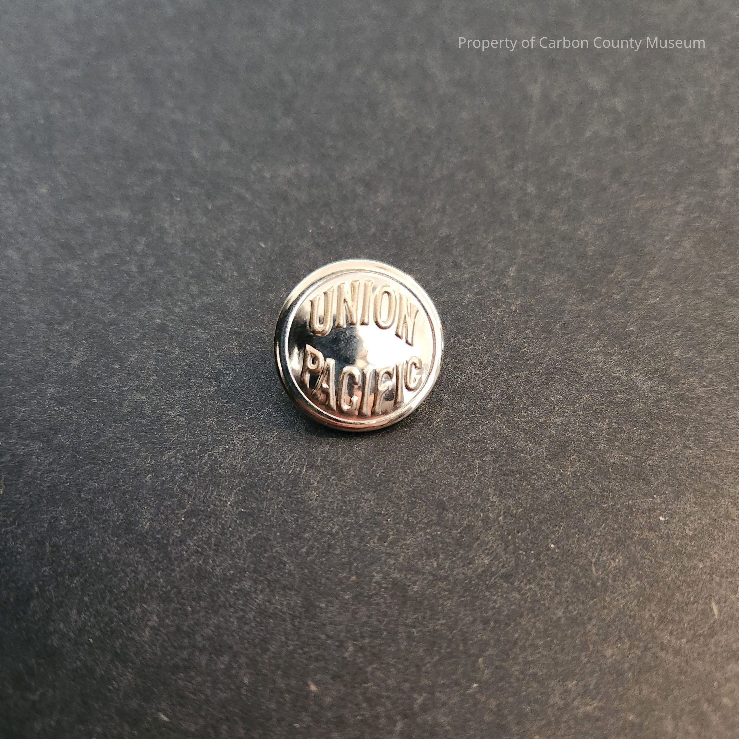 A metal button, likely tin, with the words "UNION PACIFIC" embossed on the face, on the reverse the words "SUPERIOR QUALITY" are etched into it.