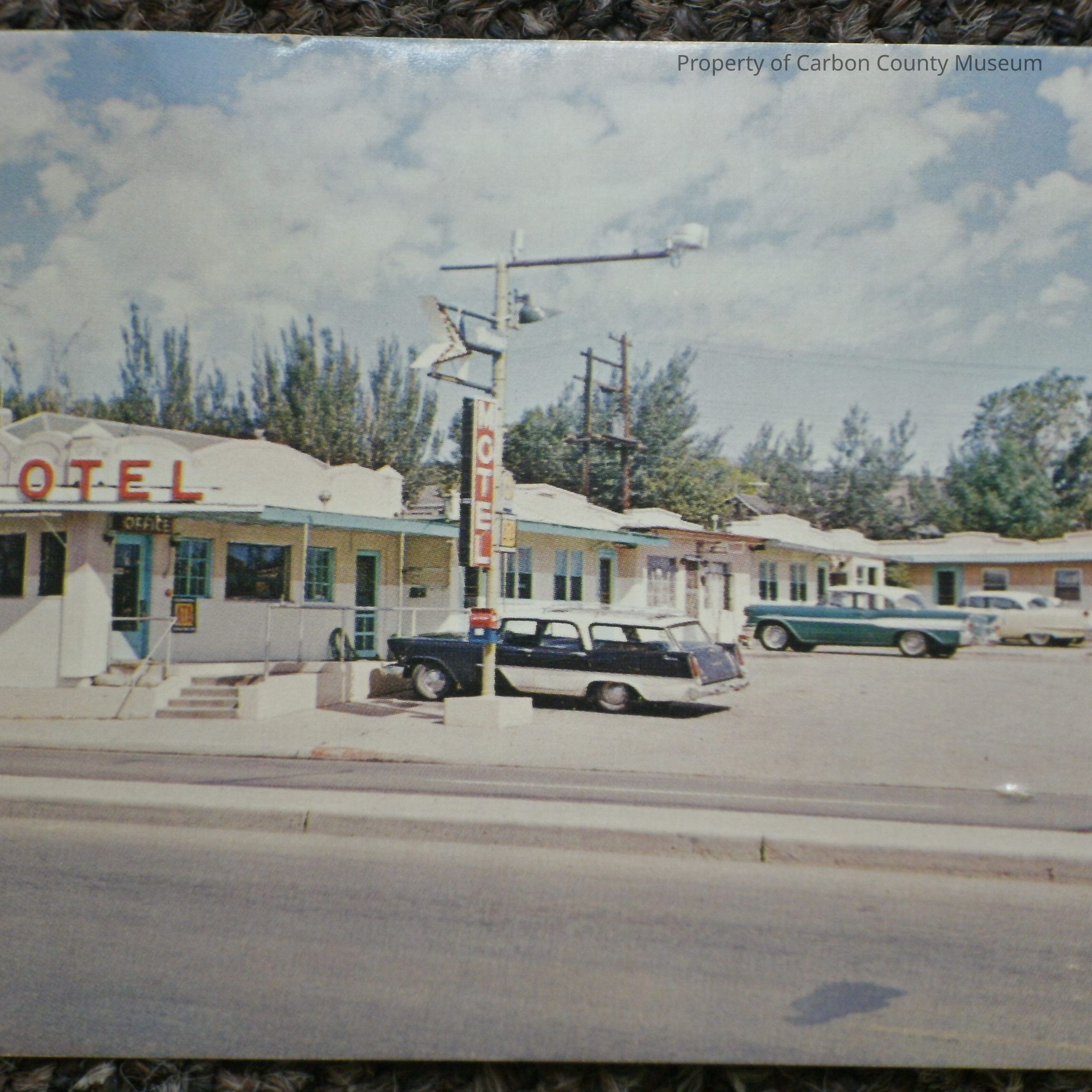 A colored print postcard. Image shows a white front building with attached linear units each with door and windows. The building has turquoise trim. A large pole at front has a red sign that reads Motel. The front of building at left has two red letter signs that each read Motel on the roof top. Various cars are parked in front of the building. A empty paved street in foreground. Written on back in black ink: office was Dream Grill. Bill Koontz ran it before going to the Venice Cafe then adams Restrant (sic) then to Crescent Junction. 2010 still owned by Sandy and Mark Bubba Kulmus and T'Keg Saloon. Good condition, some soiling and wear.Collection