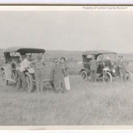 Update March 2011: Black & white snapshot print. Image of two vintage cars in the foreground. On photo left in front of car are two men & two women, one man has on skull cap & eye covering. Car on photo right has a young girl on car fender & two men standing. License number is "2231". In the background is a sheep wagon, corral & several head of horses.