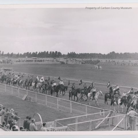 Update 2008: Black and white print. Snapshot. Image of a large group of horseback riders carrying flags as they walk along a track at a rodeo arena. Fences and chute (#4) with spectators in foreground. Large open space in midground with corrals, grandstand, spectators and trees in background. Two riders are crossing the open space near center.
