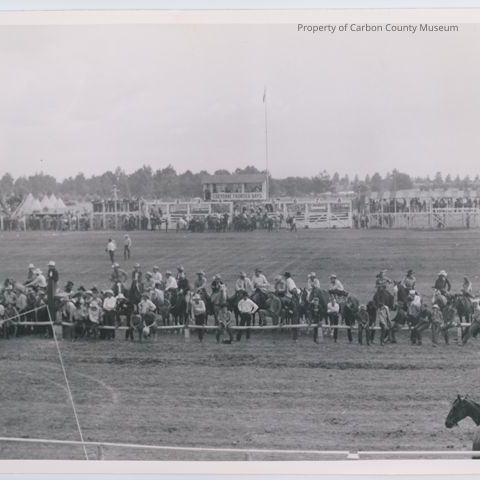 Update 2008: Black and white print. Snapshot. Image of a large group of people. Some on foot or sitting and some on horseback gathered at the railing of a track. Open area area in midground. Grandstand, spectators, announcing booth, tipis and trees in background. Banner on announcing booth reads "Cheyenne Frontier Days". Two lines of rope? tied across track at left foreground.