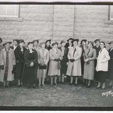 Update - 2009: Black & white contact print. Snapshot. Image of a group of 18 women posed in front of a stone building. The women are all dressed in calf-length dresses, most have on coats & all but one are wearing hats.