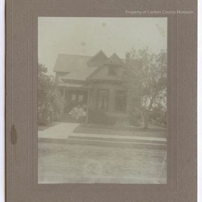 Photo of a tan colored house with two peaks at the roof line and eight people on porch. A large elephant plant in yard. It does not seem to be a Rawlins house.
