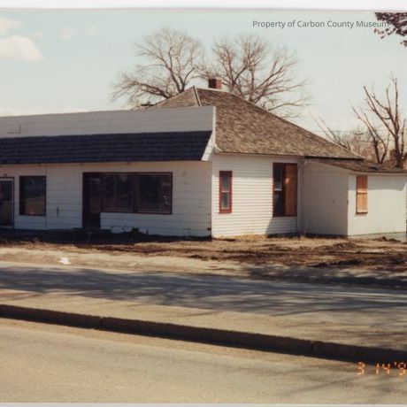 Update - 2009: Color print of clapboard building with sided front & flat facade above a short roof overhang above door & windows. Two windows on end are boarded up. Dirt ground around building with sidewalk, curb & street in foreground.