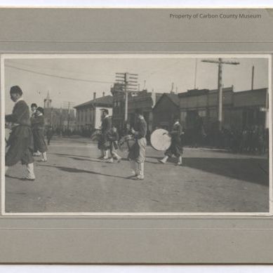 Update - 2009: Black & white print. Snapshot. Mounted on grey matboard with frame around image. Black & white image of a fife & drum corps marching across a dirt street. Spectators line the street in front of the buildings in the background. Marchers are wearing balloon pants, white spats, dark short jackets & fizzes.