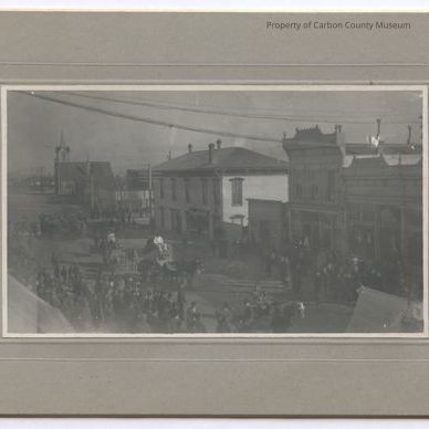 Note taped to back of matboard: "South side of 400 block on Cedar[.] Photograph between 1908 and 1910. Note Elk horns over entrance to old Masonic Building on South [corrected to "West"] corner 4th and Cedar. Masonic built in fall 1880[.] Burned in 1930's[.] One story building west occupied on March 1887 by Palmer and Learn March 1889 Lindberger and Toni Connon had Meat Market.
