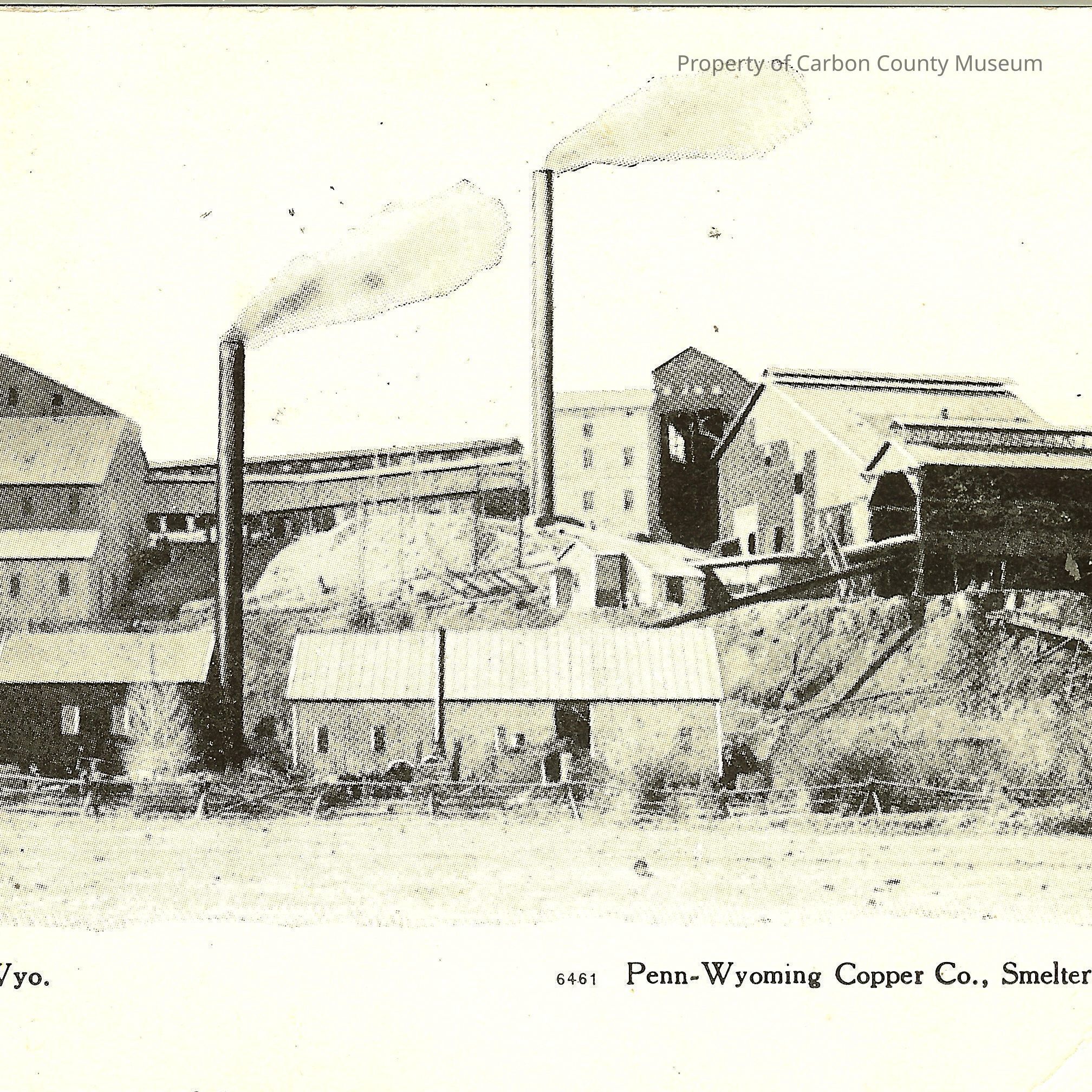 Black and white photo on postcard paper. Picture of Penn-Wyoming Copper Smelter in Encampment. Photos has 2 smokestacks and several buildings and walkways. Printed on the front in black: "Encampment, Wyo. Penn-Wyoming Copper Co., Smelter and Reduction Works. Manufactured by Curt Teich & Co., Chicago, Ill." Printed on the back in black: Post Card. This space may be used for written or printed matter. The address to be written here." A green 1 cent stamp which has been canceled is in right corner. Postcard addressed to: "Miss Alivilda Pool, Nebr..."Collection