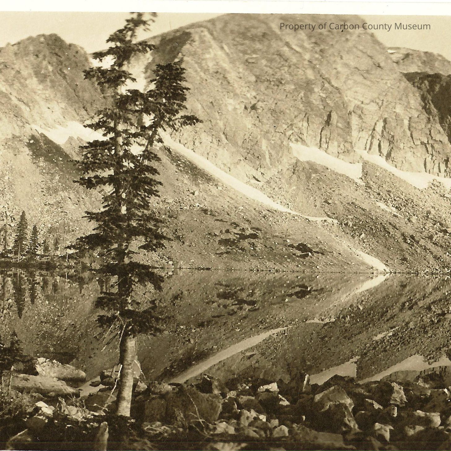 Black and white panoramic small photo of Lake Marie. A large mountain with snow around base and a large lake in front. There are several fur trees around the left and right side and two in front. Many rocks cover the shoreline. Printed on the front in black ink: Lake Marie, July 1919 Carbon Co. Wyo. Medicine Bow peak 12004 Ft. El.Collection