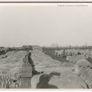 Update - 2009: Black & white snapshot of a wooden feeding trough with long rows of sheep on each side with their heads down eating. Other sheep are seen left and right side milling around in the large fenced area. A large building's roof line is seen in the distant background. Horizon is flat and sky appears clear.