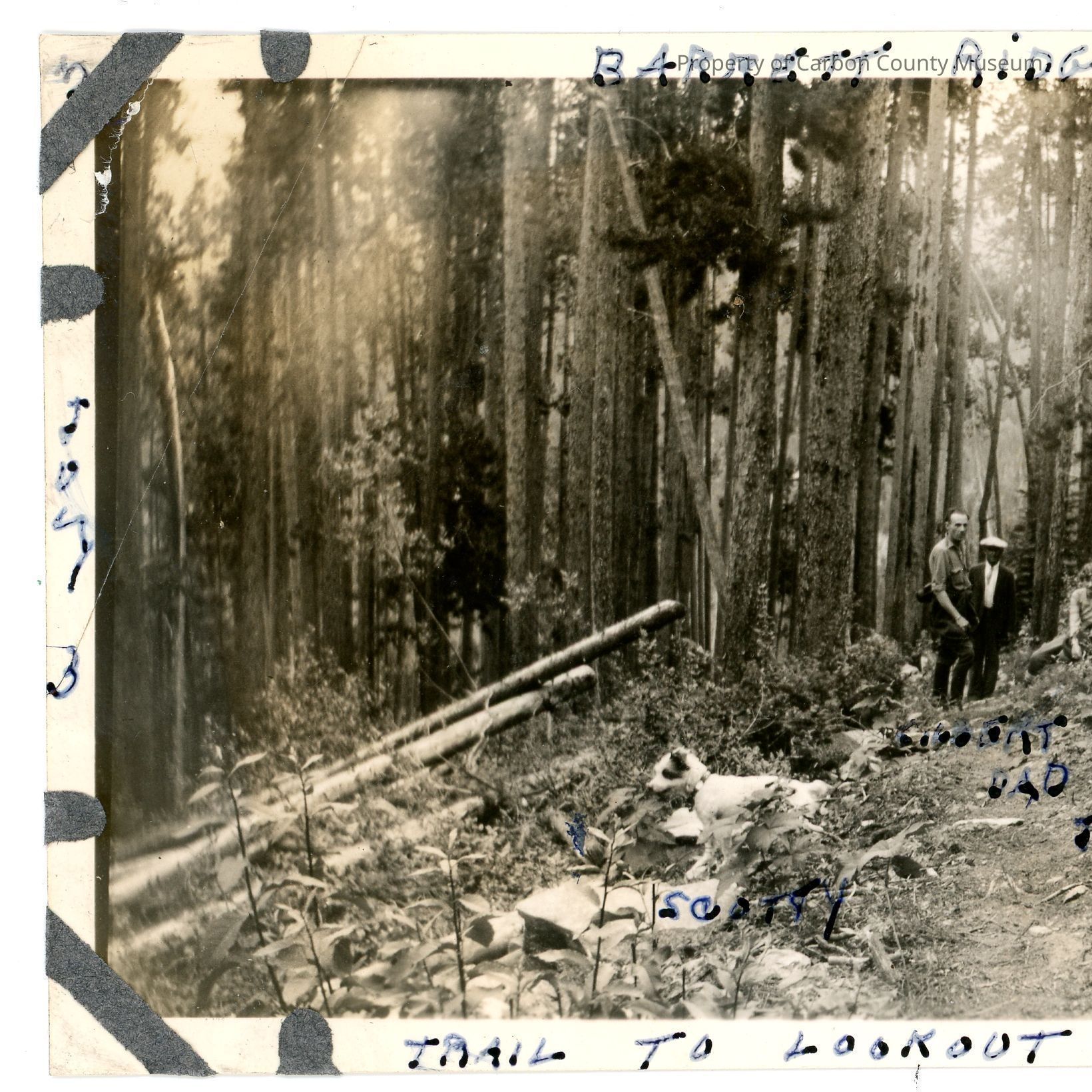 Black and white photograph. Three men are standing on a path in a forest, the writing is too small to identify them aside from the man in the middle is "DAD". There is also a small dog in the underbrush. Written along the top edge of the photograph is "BARRETT RIDGE", along the bottom "TRAIL TO LOOKOUT TOWER", vertically along the left "JULY 3", vertically along the right "1934". The number 056 is printed on the reverse.Collection