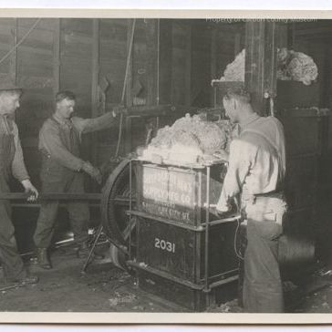 Update - 2009: Black & white print of three men standing inside wooden building with two of the men left side wearing overalls, boots, & work shirts. Writing is seen on the walls behind men. One is holding a very long lever handle and the other man has his gloved right hand on a smaller, nearer lever and his left hand on a rope above his head. A large bagging machine is connected to these handles filled with wool. The third man is right side with his back to camera, his left hand on a short handle and his right hand resting on top of side of machine. A large and small cogged wheel is seen on machine left side. Front of machine has stamped white lettering: Sheep & Cattlemen, Supply MFG Co., Builders, Salt Lake City, UT 2031