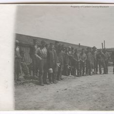 Update - 2009: Black & white snapshot of a large group of men dressed in dark clothing standing on harden ground in an informal semi circle. Man on left side has a lunch pail? & other men left side are holding open bladed shears. There are buildings seen behind men.