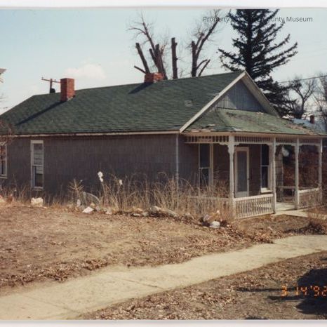 Update - 2009: Color print. Snapshot. Image of a grey wooden house with green roof & front porch. Two red brick chimneys on roof. Dirt, weeds & trash in yard. Sidewalk in foreground. Date stamp in lower right: "3 14 '92". Trees in background.