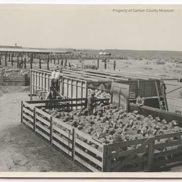 Update - 2009: Black & white print of a group of large wooden fenced structures holding large groups of sheep. One structure behind open pen in front has side walls with two men up on wooden boxes spraying into pen over the wall. Other more open fenced corrals are seen in background. Horizon appears flat and barren.