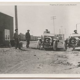 Update 2/2010: Black and white print . Snapshot printed on postcard paper, unused. Image of four men and two vintage automobiles on a dirt lot. One man is in each of the automobiles which are right hand (English) drive; other two men are standing at left . A large "C" is on the radiator of each of the vehicles. Frame building, large pole and wheel barrow(?) at left with train in background. Derricks, telephone poles and tall smokestack in background at center and right.