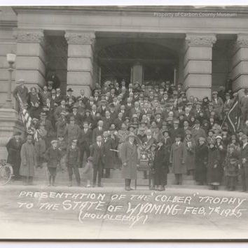 Update 2008: Black and white print of large group of men and women and a few children standing on the steps of the Wyoming State Capital Building. They are primarily dressed in suits nd hats. Most all have heavy looking coats on. The women are all wearing long coats. There are several males in various types of uniforms. A boy scout is seen on side right. The focus of the group is a man and woman to the front of the group with a trophy of an American Eagle with its wings expanded resting on a small table between them. A bicycle is propped against a sandstone pilaster on side left which has a lamppost top it as does the other side. People are standing atop this feature in both sides of the wide stairs. An United States flag is on side left and an unclear type flag is on side right.