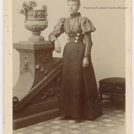 Update 2009: Black and white print. Cabinet card. Studio portrait. Full length image of a woman standing with her right elbow resting on a carved ornate baluster with a urn on top. A stool is behind her at right. She is wearing a dark skirt with high waist and large white buttons and a patterned blouse with long sleeves and blousing bodice and sleeve tops. her hair is pinned up.