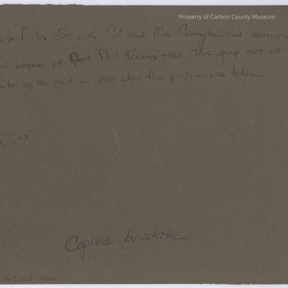 Written on back in black ink: Wm Daley Sr. with Col. and Mrs. Carrington and survivors of Indian warfare at Fort Phil Kearney 1866. This group met at the old site of the fort in 1908 when this picture was taken. Copied by the state.