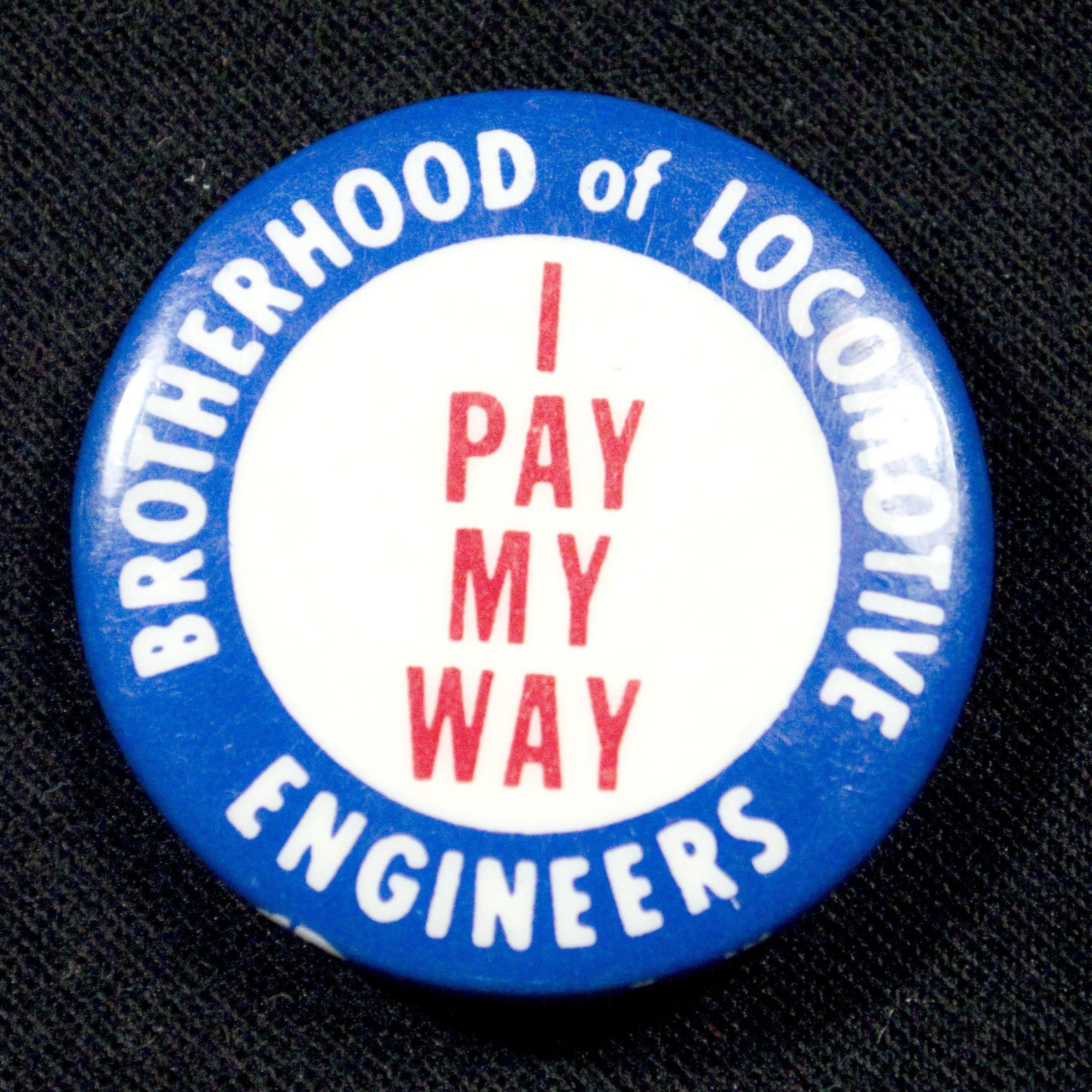 one metal button, circular, blue border with white center, in white around the border it reads "Brotherhood of Locomotive Engineers", in the center in red it reads "I Pay My Way", the donor's grandfather- John Richard Michie - owned this button, he worked for the Union Pacific Railroad and retired June 29, 1983 at the age of 64.Collection