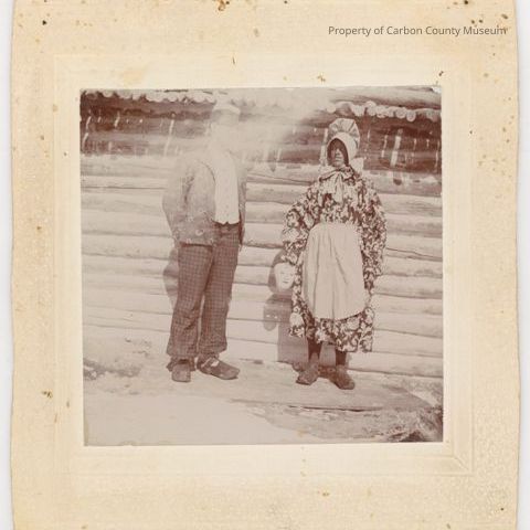 Update 2009: Black and white print. Mounted on cream colored matboard with a patterned border. Snapshot. Image of two people standing in front of a log building. Both people are in costumes. One a man, one man dressed as a woman. woman holding a mask and wearing a large brimmed sunbonnet. Over exposed on man's face.