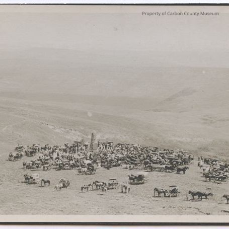 Update - 2009: Black & white print attached to black mat which has been cut off with resulting rough edges. Photo show a birdseye view of a very large gathering of horse drawn buggies & carriages, & a very few vintage automobiles, many around a rock & mortar monument shaped like a huge cone that rises high into the air with a large shield type plaque attached to front. (It is not possible to read plaque). People are standing, many are on horseback or in carriages. Wide expansive land with hills are seen in background. Due to the distance of the view, details are difficult to view. A crosstie with insulators is seen in center foreground.