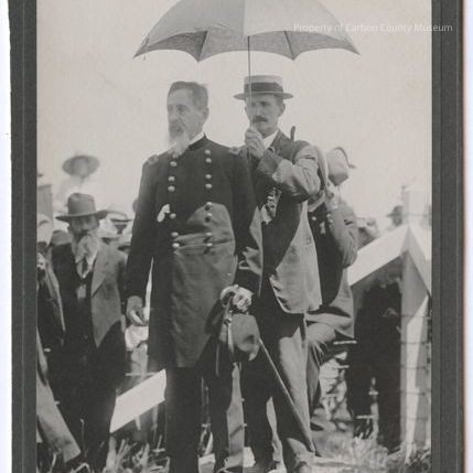 Update - 2009: Black & white print attached to black matboard which has been cut down with rough edges exposed. Photo shows Colonel H. B. Carrington in dark military uniform with a long, dark double breasted frock coat with rows of eight buttons on each side. A white collar shows at uniform neck edge. He is standing with a hat and a cane in his left hand at side. A white handkerchief is stuck in his jacket at an angle at his right. His hair is light colored. He has a grayish mustache and scraggily beard. A man with a dark suit is standing behind Carrington holding an open umbrella over his head. Other men all seen standing in background with a white lumber fence support and attaching fence wire in background creating a separation from men in front to men in background.