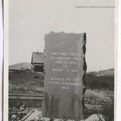 One black & white print of the marker. Engraved on marker is: "Fort Fred Steele U S Military Post June 30 1868 to August 7, 1886 Marked by the State of Wyoming 1914"