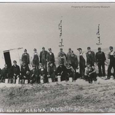 Update March 2011: Black & white copy print of a line of men. Some of them are kneeling & have buckets setting on the ground in front of them. They have on miners hats with lamps on them. A shed is behind them. Printed in white on bottom: "Mine Hanna, Wyo 7-23" Written above two heads: "John Matson & Jack Swan"