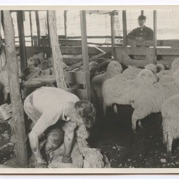 Update - 2009: Black & white print 4 3/4 x 6 3/4" with a reprint 3 1/2 x 5". Original shows a large group of sheep in various stalls with a man bent over shearing a sheep. A small stack of wool is on the dirt floor beside the sheep's body. Strands of twine are hanging down to side of man. Another man is standing on outside railing of corrals.