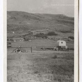 Update - 2009: Black & white snapshot of a countryside scene with barren hills in distance. Small teepee is seen in background left, a small frame building is in center background with foliage in front and to it's side. A wooden wagon is on its left side. A metal pole railing is seen left side with a roofed doghouse near center railing pole. A sheepwagon is on right side with bedding hanging on pole fence railing. Desert type vegetation seen in immediate foreground.