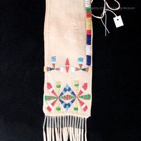 A buckskin Santee Sioux beaded and fringed pipe bag. Bag is 17" in length and 5.25" width at top and 4.5" width at lower edge. Fringe hangs from silver bugle beads at this lower edge. There is a narrow leather string tie on the back side. There is a beaded design around top edge of bag with yellow, dark blue, light blue, and white beads. This design extends down one side on the front of the bag 11.25." On the lower edge of the bag front is a dual geometric star? shape beaded design in the above colors and three small triangular beaded shapes above the stars. Donor obtained in Nebraska. Object is circa 1950's according to donor.Collection