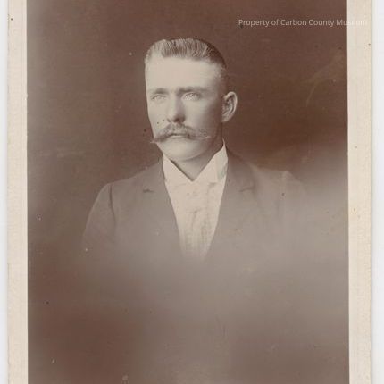 Update 2008: Black and white print. Studio portrait. Cabinet Card. Mounted on off-white matboard. Head and shoulders portrait of a man in a dark suit coat, white shirt and light colored patterned tie. His hair is short and combed straight up in front, he has a large mustache. Bottom of image fogged out during developing.
