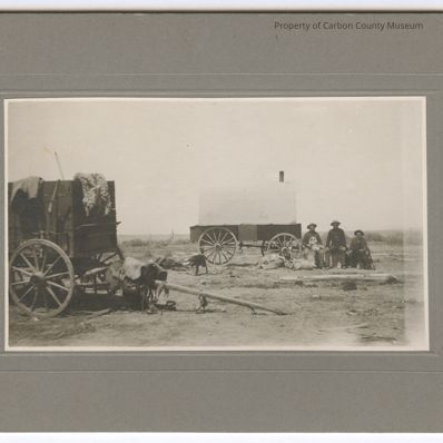 Update - 2009: Black & white print attached to dark gray matboard which has narrow engraved border around print. Print shows a high sided supply wagon with it's long tongue extended to ground with a saddle resting on it's upper edge by wagon front. Seen in center is a sheep wagon parked horizontally with a group of three men seated in a row on it's wagon tongue. Man on left has a fuzzy light colored dog with it's legs on man's knees.