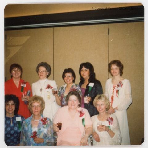A- 6 similar photographs of 9 women, five standing in back and four sitting in front, four have glasses on, two read "Bottom R, 2nd from L. f. Kay Ross" used as a mystery photograph (05-20-2014), top second from the left is Rose Krysle, bottom second from the left is Kaye Long, top on the right is Karen Bennett, and bottom right is Lana Spicer. Terri Martinez emailed and said "Garri Reis, Rose Krysl, Terri Sanchez, Pauline M. Parsons, Karen Ross.