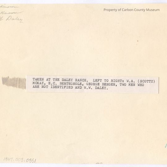 Typed on attached piece of paper: "Taken at Daley Ranch. left to right: "W. A. (Scotty) McKay, E. C. Bertgnole, George Bergen, Two men who are not identified and W. W. Daley"