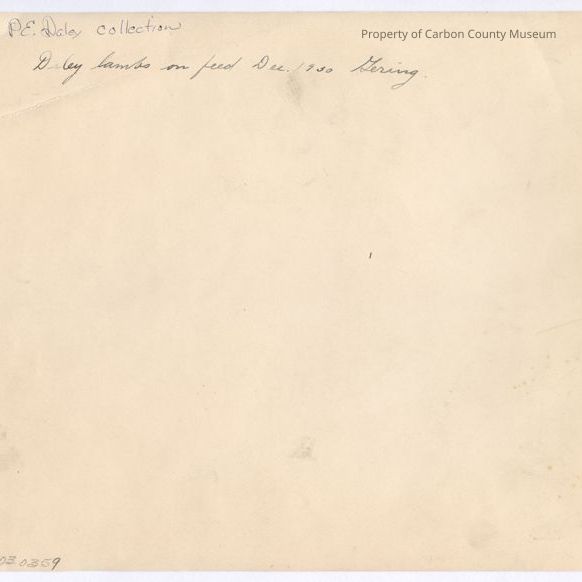 Photo of Daley lambs at Gering, Nebraska feed lots. Update 2012: A black and white print of a sheep feedlot. There are multiple white wooden fenced areas with different bands of sheep within. Foreground shows loose hay on the ground with a single large pile of hay at right. Horses and cattle are contained In the distant background fenced areas. A large barn is at center back of photograph, with a windmill behind the structure. Other smaller outlying buildings are seen in the distance. Sheep at the left foreground of photograph have their heads stuck through the railing of the fence eating hay on the ground. Written on the back of the photograph in black ink: "Daley lambs on feed Dec. 1930 Gering. " Written in blue ink: "No. 3-P. E. Daley collection." Condition is good with multiple issues including red stain at photo left, unknown accretion at various areas, other soiling, cracks, and bends, bent corners, and more.Collection