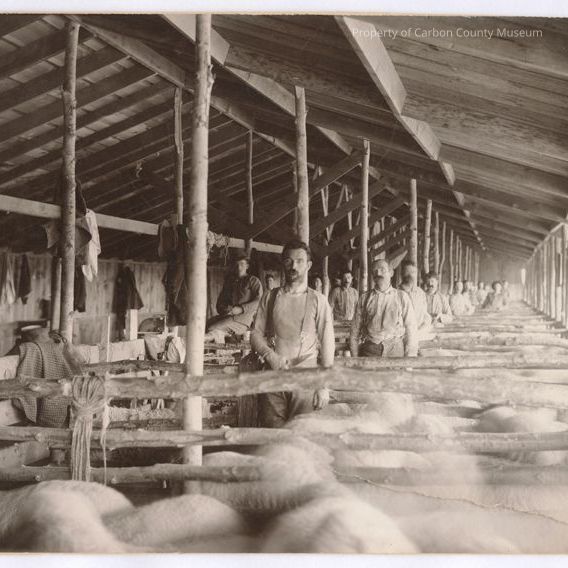 Update - May 2010: Two black & white prints. Snapshot. Mounted on tan matboard. Image of a large group of men stationed along a row of sheep pens. Gabled roof covering pens; right side appears to be open; left side walled up. Rough-hune logs separate each pen & are used as uprights through center. Men are all in work clothes. Man in center front is holding a hand sheer. Sheep are piled in the pens; men are ready to sheer them.