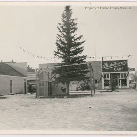 Update - 2009: Black & white print of a wire pen with a deer inside. Also inside is a tall evergreen tree that is decorated. It appears to have bells on garland, hanging on bottom branches. In the background is a stone building with large windows & doors on end & wood double doors on side. A sign painted on building reads: "Studebaker Cars". A clapboard building is on photo left & a sign between buildings reads: "Variety Store". Three vintage cars are parked around businesses. Photo taken on 200 block of 5th street looking west.