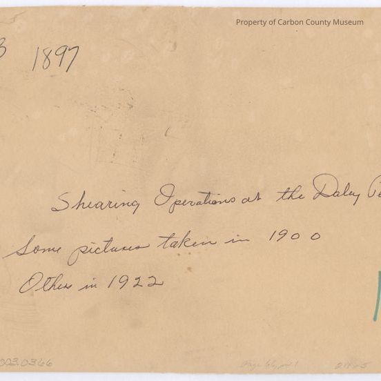 Written on back in black ink: 1897 shearing operations on the Daley Pens. Same pictures taken in 1900 Others in 1922