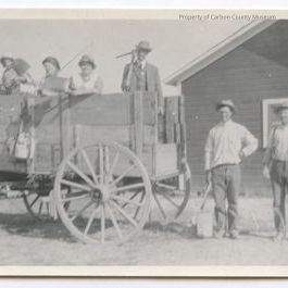 Update - 2009: A black & white snapshot of a large high-sided wooden freight wagon with three women standing on front side inside wagon. A man standing on right in wagon is wearing a three piece suit with a pick over his right shoulder. There is a shovel with spade end showing between first two women in wagon. There are two men standing at rear of wagon wearing pants, white shirts and hats. A dark wooden frame building with white eaves and window frames is behind the men. Barren ground is in foreground. Photo does not have clear detail.