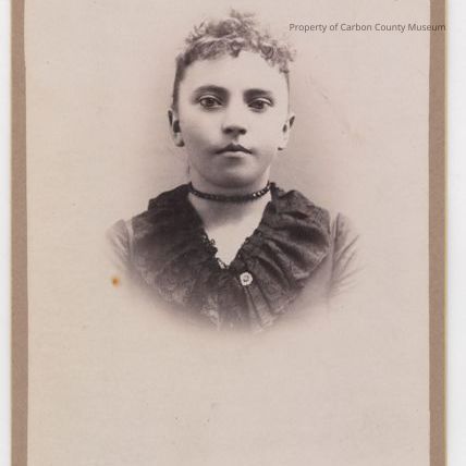 Girl in an outfit with a black lace collar and a dark colored beaded necklace showing only shoulders and head.