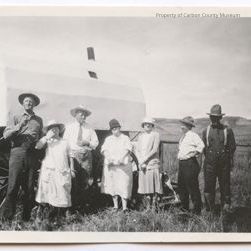 Update - 2009: A black & white snapshot of a sheepwagon with it's large stovepipe rising through canvas roof, and a group of 4 men and 3 women standing in a informal line at side front of wagon. Man on left is wearing a dark work type pants, medium tone long sleeved shirt, hat & is smoking a cigarette. Woman to his left is dressed in white loose cotton type dress, wearing boots & a brimmed hat. She is smoking a cigarette with her right hand and arm at an angle. Man to her left is wearing pants, white dress shirt with tie and a hat. He also is smoking. Another woman is standing next to him, and is wearing a loose white dress and a black round? tiny bunned hat. Man on the far right of print is wearing dark pants, shirt and high crowned hat. Wagon and people are in a grassy area with strand fence in background with rising hills in the far distance.