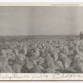 Update - 2009: A black & white snapshot showing a very large flock of sheep hunched closely together with a man dressed in dark clothing standing behind a lumber fence shaped like "U" from where he is feeding" the sheep. Various shaped wooden fence sections are seen on side left. Flat horizon is seen in distance.